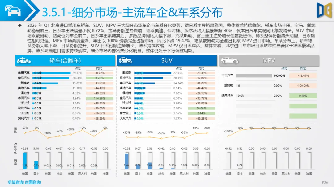 细分市场中,轿车、SUV、MPV均同比下滑,MPV由丰田独家垄断;主流豪华车型普遍下跌,宝马2系、牧马人等小众性能车型逆势增长,个性化需求成为唯一亮点。整体来看,进口车受国产新能源高端化冲击最大,产品结构陈旧、电动化滞后,长期下行趋势难逆转。