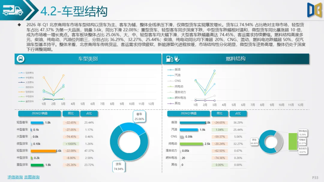 北京商用车一季度销量7.6k辆,同比下降22.53%,2 月跌至谷底,3 月强势反弹,环比增长210.15%,跌幅收窄。车型结构以货车为主(74.94%),轻型货车为核心(47.37%),微型货车同比暴涨超10倍,成为唯一增长亮点;客车占比25.06%,大、中、轻型客车全线大跌,客运需求持续萎缩。