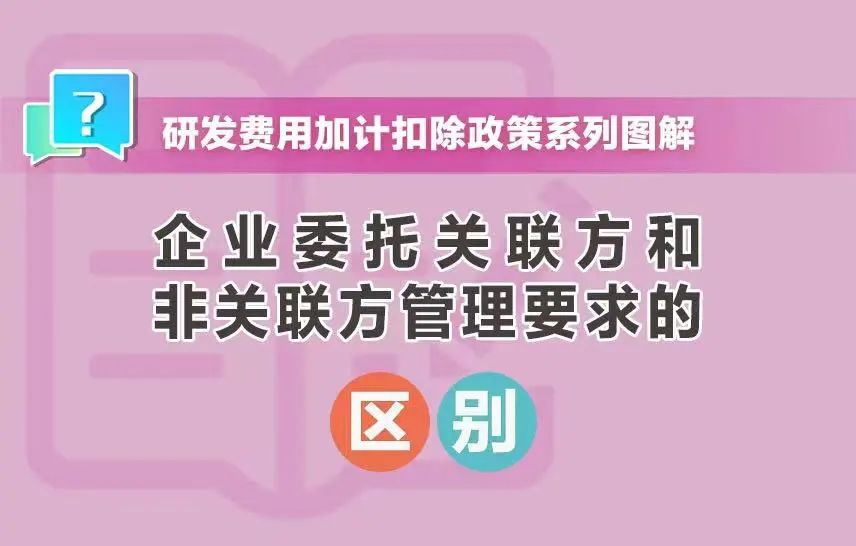 近年来,研发费用加计扣除政策持续优化完善,呈现出年年加力、步步扩围、层层递进的特点,对支持企业投入研发、鼓励科技创新起到重要作用。为帮助纳税人全方位学习了解相关政策规定,我们制作了“研发费用加计扣除政策系列图解”。今天带你了解:企业委托关联方和非关联方管理要求的区别↓