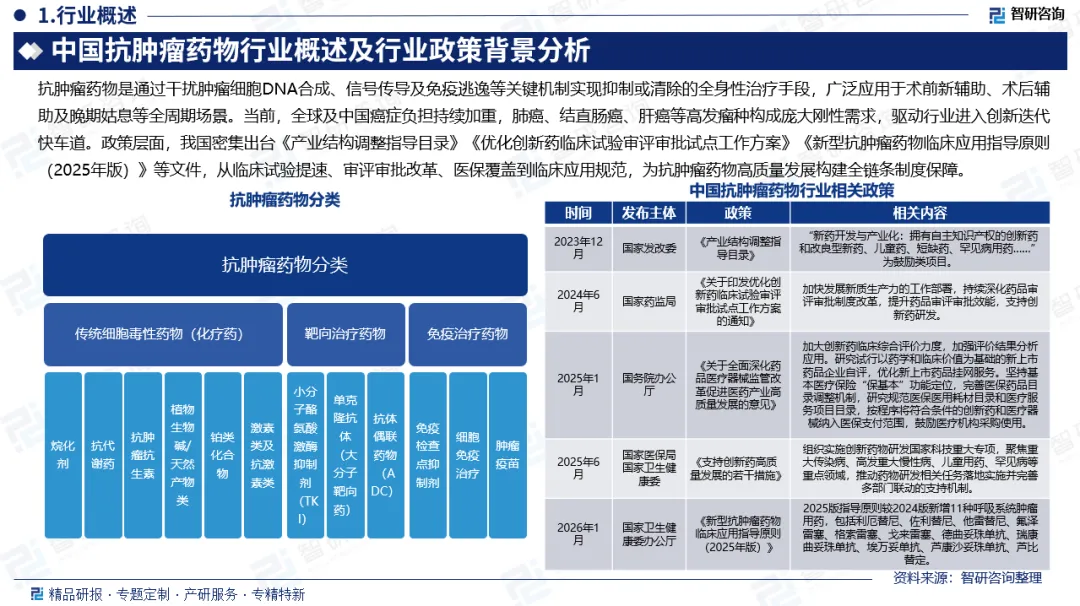 行业概述:抗肿瘤药物(Anti-tumor Drugs),又称抗癌药,是一类用于抑制肿瘤细胞生长、增殖、转移,或直接杀伤肿瘤细胞,从而治疗恶性肿瘤的药物总称。其核心作用机制是通过干扰肿瘤细胞的DNA合成、细胞分裂、信号传导、免疫逃逸等关键生命活动,实现对肿瘤的控制或清除,是恶性肿瘤全身性治疗的核心手段,广泛应用于术前新辅助、术后辅助、晚期姑息及根治性治疗等全周期场景。