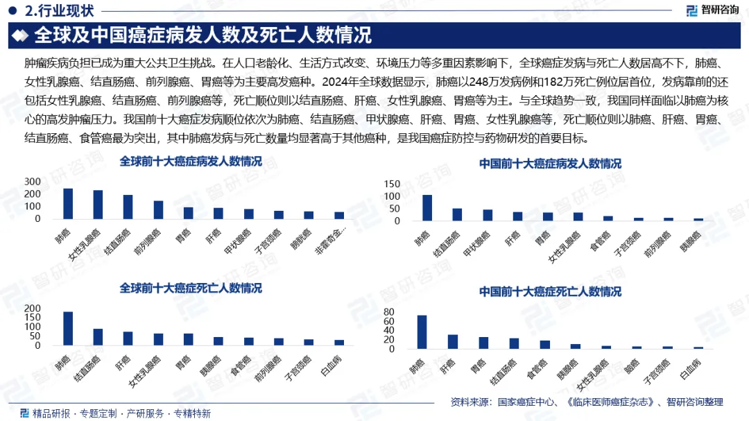 抗肿瘤药物是抑制肿瘤细胞生长、杀伤肿瘤细胞以治疗恶性肿瘤的药物总称,是恶性肿瘤全身性治疗的核心手段,广泛应用于肿瘤治疗全周期。全球范围内,受人口老龄化等因素影响,癌症发病居高不下,肺癌等为主要高发瘤种,推动免疫治疗、ADC等创新疗法落地,带动全球市场持续扩容,治疗方式已从传统化疗向精准靶向治疗转型。国内方面,癌症高发带来庞大刚性需求,国家出台多项政策从审评审批、医保支付等多方面支撑行业发展,市场以本土创新为核心驱动力,规模快速增长,治疗结构逐步与国际接轨,靶向治疗成为主流。行业形成跨国药企引领高端、本土药企突围崛起的竞争格局,本土药企在核心赛道成效显著。未来,行业将向源头创新、国产主导、生态优化方向发展,聚焦前沿技术,推进产业链自主可控,提升创新药可及性,向高质量、全球化转型。