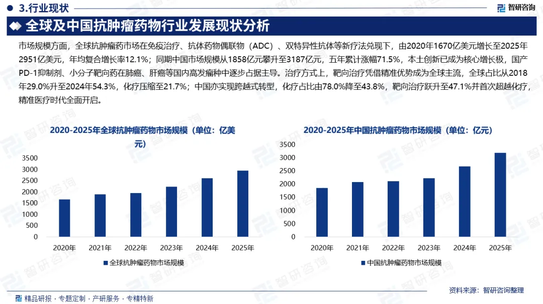 中国抗肿瘤药物市场规模:国内市场方面,中国抗肿瘤药物行业已迈入以本土创新为核心驱动力的发展阶段,在肺癌、肝癌、胃癌等我国高发癌种中,国产PD‑1抑制剂、小分子靶向药等逐步占据主导地位,市场具备强劲的内生增长动力。在创新药加速获批上市、医保目录动态调整持续覆盖新产品等多重利好推动下,中国抗肿瘤药物市场规模从2020年的1858亿元攀升至2025年的3187亿元,五年净增1329亿元,累计涨幅达71.5%,增长势头显著。