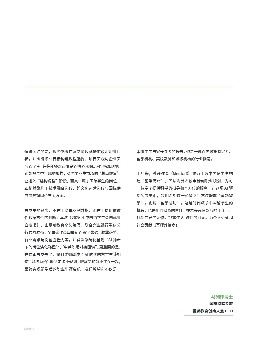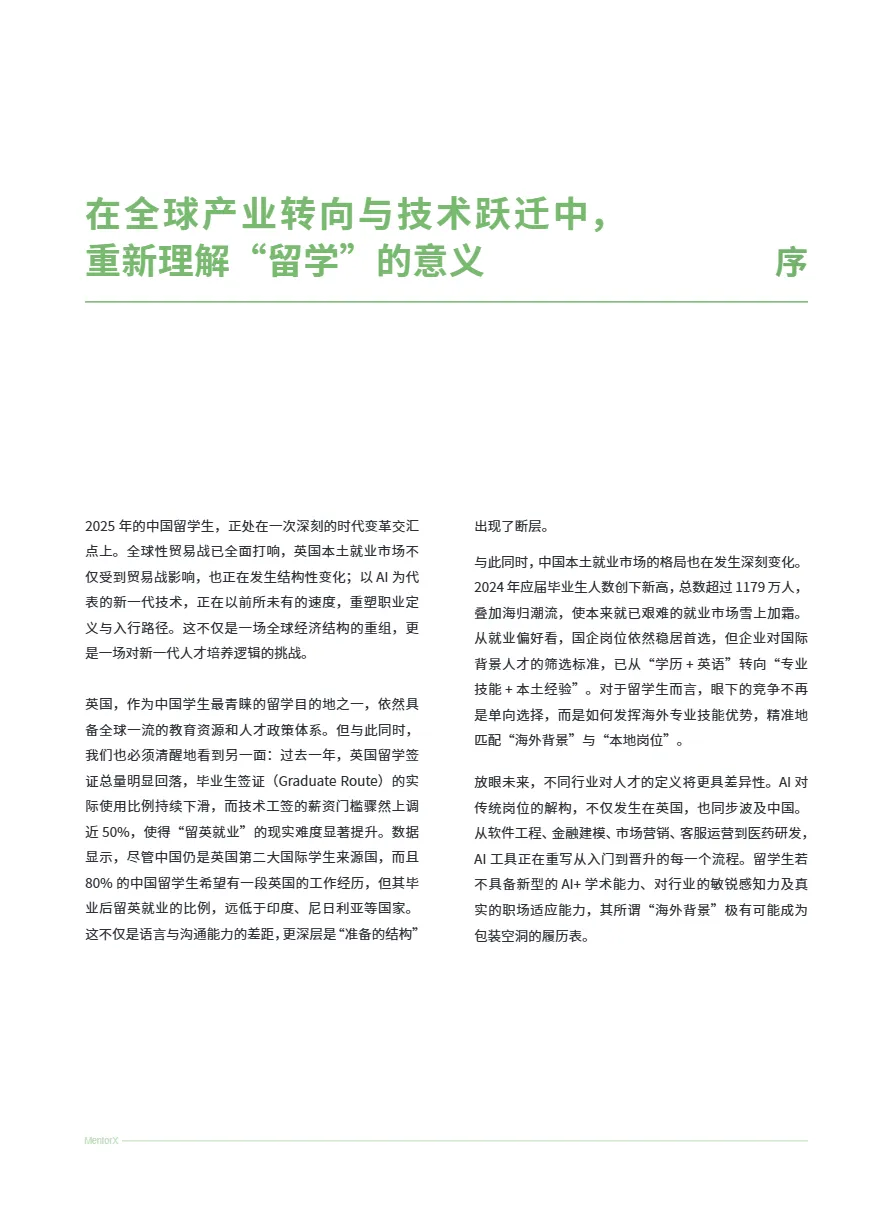 本文件深度剖析了2025年中国留学生在英国的就业现状与未来趋势,为出海家庭、留学服务机构及跨境人才提供了从“成功留学”到“留学成功”的全链路职业规划指南。文件指出,随着全球贸易战深化与AI技术对职场的重构,传统“学历+语言”的留学回报模式已失效,留学生必须以“以终为始”的战略思维,打通“专业—技能—实习—签证—就业”的闭环路径,才能在高度竞争的中英就业市场中突围。