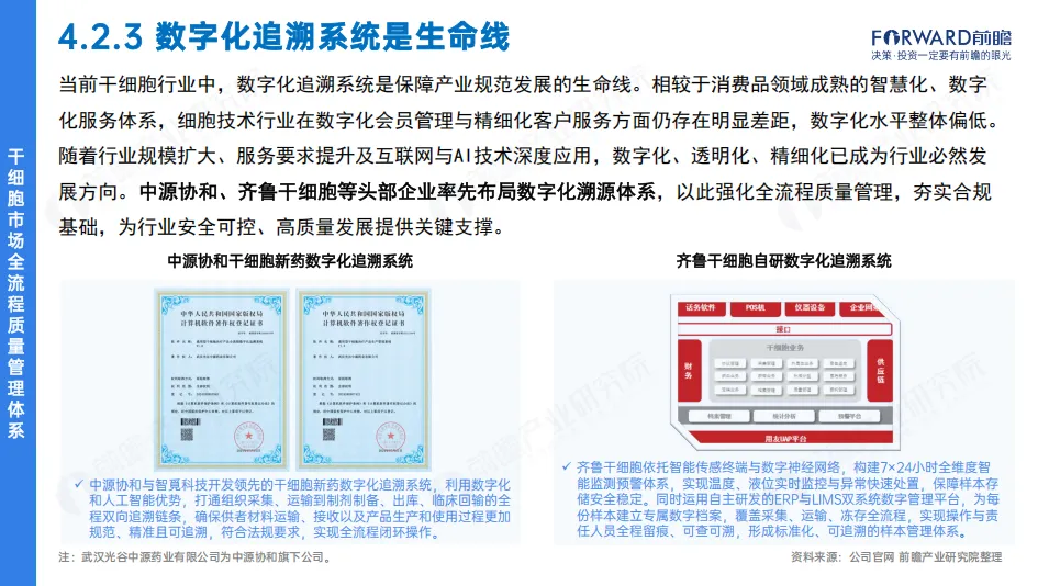 白皮书特别强调了数字化在干细胞产业中的重要性:"相较于消费品领域成熟的智慧化、数字化服务体系,细胞技术行业在数字化会员管理与精细化客户服务方面仍存在明显差距,数字化水平整体偏低。"齐鲁干细胞率先布局数字化溯源体系,依托智能传感终端与数字神经网络,构建7×24小时全维数据监控报警系统。这套系统能够实现温度、液位的实时监控与异常快速反应,保障样本储存的安全稳定。同时运用自主研发的ERP与LIMS双系统数字管理平台,为每份样本建立专属数字档案,覆盖采集、运输、冻存与应用全流程,实现操作与责任人员全程留痕、可查可溯。