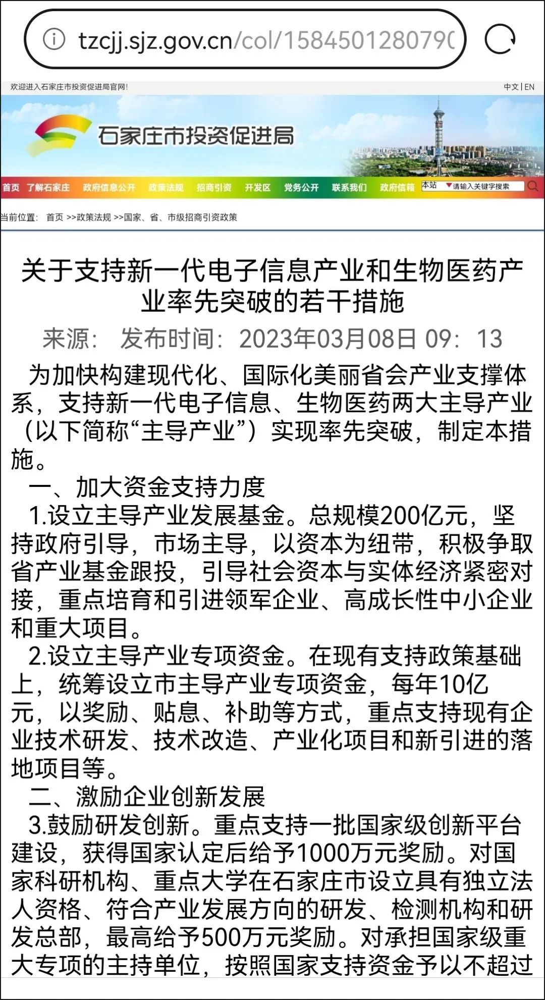 中药的I类创新药、II类改良型新药,获得新药生产批件并在石家庄市实现产业化,分别给予最高1.2亿元、3000万元奖励;