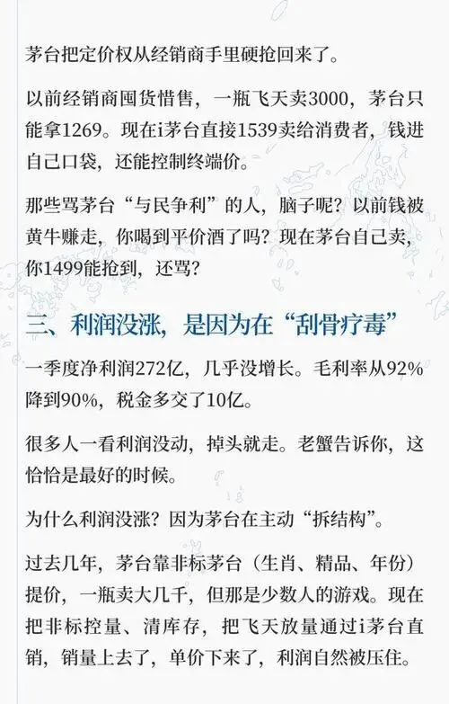 直销占比从49%升至55%,意味着每赚一块钱,就不再有中间商分羹;原本炒到3000元的飞天,现在通过i茅台直发,标价1539元,实打实进厂家口袋。