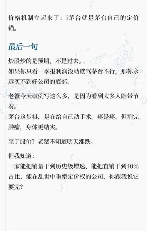 彼得·林奇说:“投资的最高境界,不是预判风暴,而是看清潮水的方向。” 当所有人都盯着那7%的营收增速时,有人已看出茅台正在用一场悄无声息的转型,重构整条价值链。