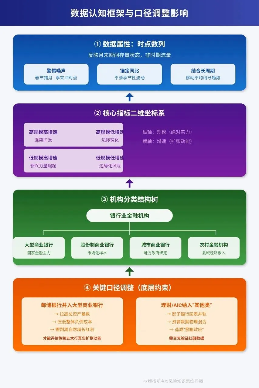 数据集提供了“余额”与“比上年同期增长率”两个核心维度。在资产负债表分析的理论框架中,余额代表了金融系统的“规模底座”和资源池容量,是绝对实力的体现;而同比增速则代表了系统的“扩张动能”和“边际变化”,是生命周期阶段的指示器。规模与增速的二象性,为我们构建了一个二维评价坐标系:高规模高增速代表强势扩张,高规模低增速代表庞然大物的边际钝化,低规模高增速代表新兴力量的崛起,低规模低增速则预示着边缘化风险。本报告的结构拆解正是基于这一二维坐标系展开。