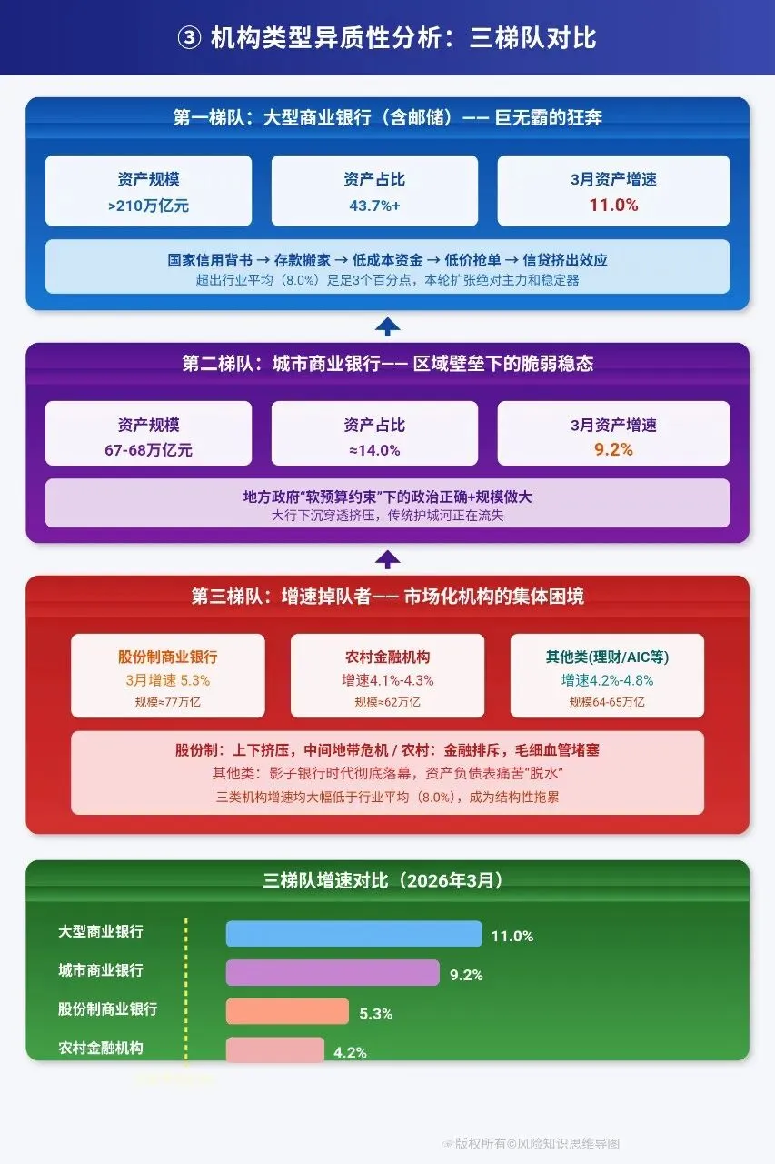 在总量增速放缓的宏观背景下,结构性的分化成为了理解2026年一季度银行业数据的“主钥匙”。我们基于前述的二维坐标系,将各类机构划分为三个截然不同的梯队,揭示金融资源分配的微观图景。