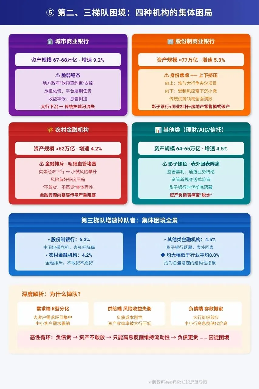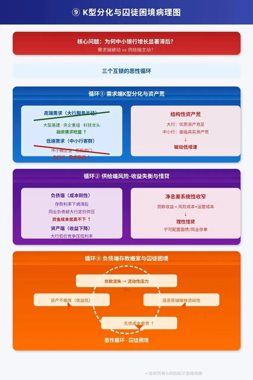 - 中小银行被迫下沉引发的道德风险:在主流优质市场被大行占据后,部分为了规模生存的中小银行可能被倒逼走向另一个极端——放松风控标准,向原本不符合授信条件的高风险客户下沉,以获取高息差来弥补规模损失。这种“饮鸩止渴”的行为,将在未来两到三年内转化为庞大的不良资产。