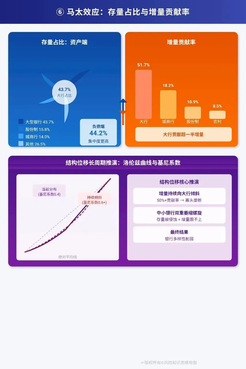 4.3 结构位移的长周期推演结合洛伦兹曲线和基尼系数的概念来思考,如果这种增量贡献率持续向大行倾斜(假设未来几个季度大行贡献率维持在50%以上),那么银行业资产分布的洛伦兹曲线将加速向右下角弯曲,基尼系数将迅速扩大。这意味着中小银行将陷入“存量被侵蚀、增量跟不上”的双重萎缩螺旋。长此以往,中小银行将被迫从综合性的信贷提供商,退化为大行的资金分销商或特定细分领域的边缘玩家,中国银行体系的多样性和多层次性将遭到实质性削弱。