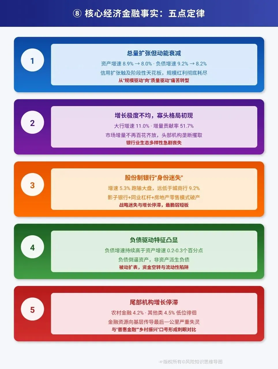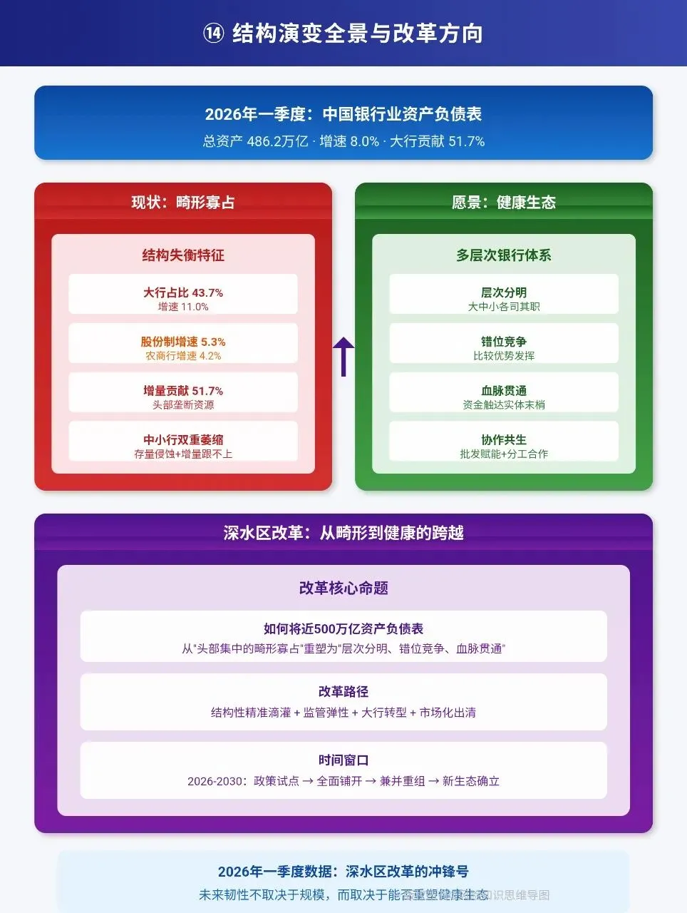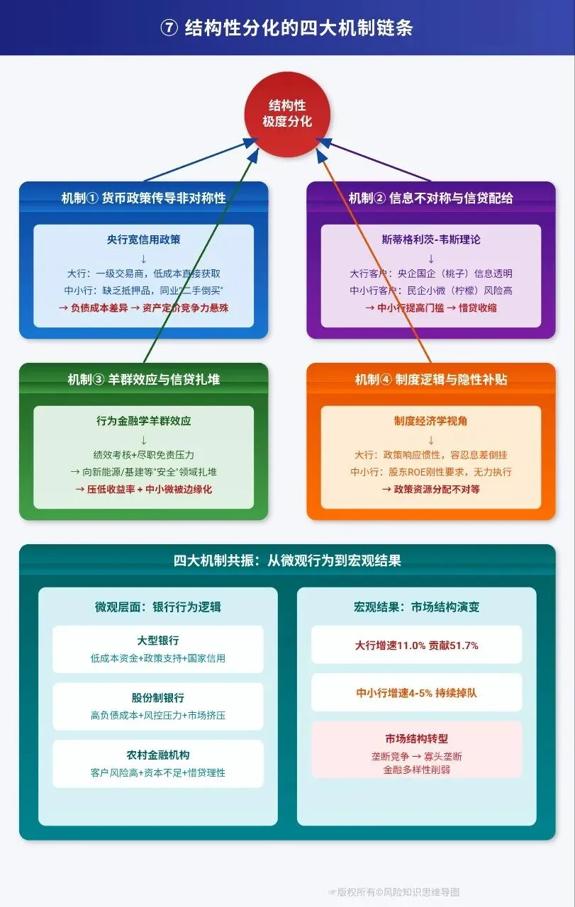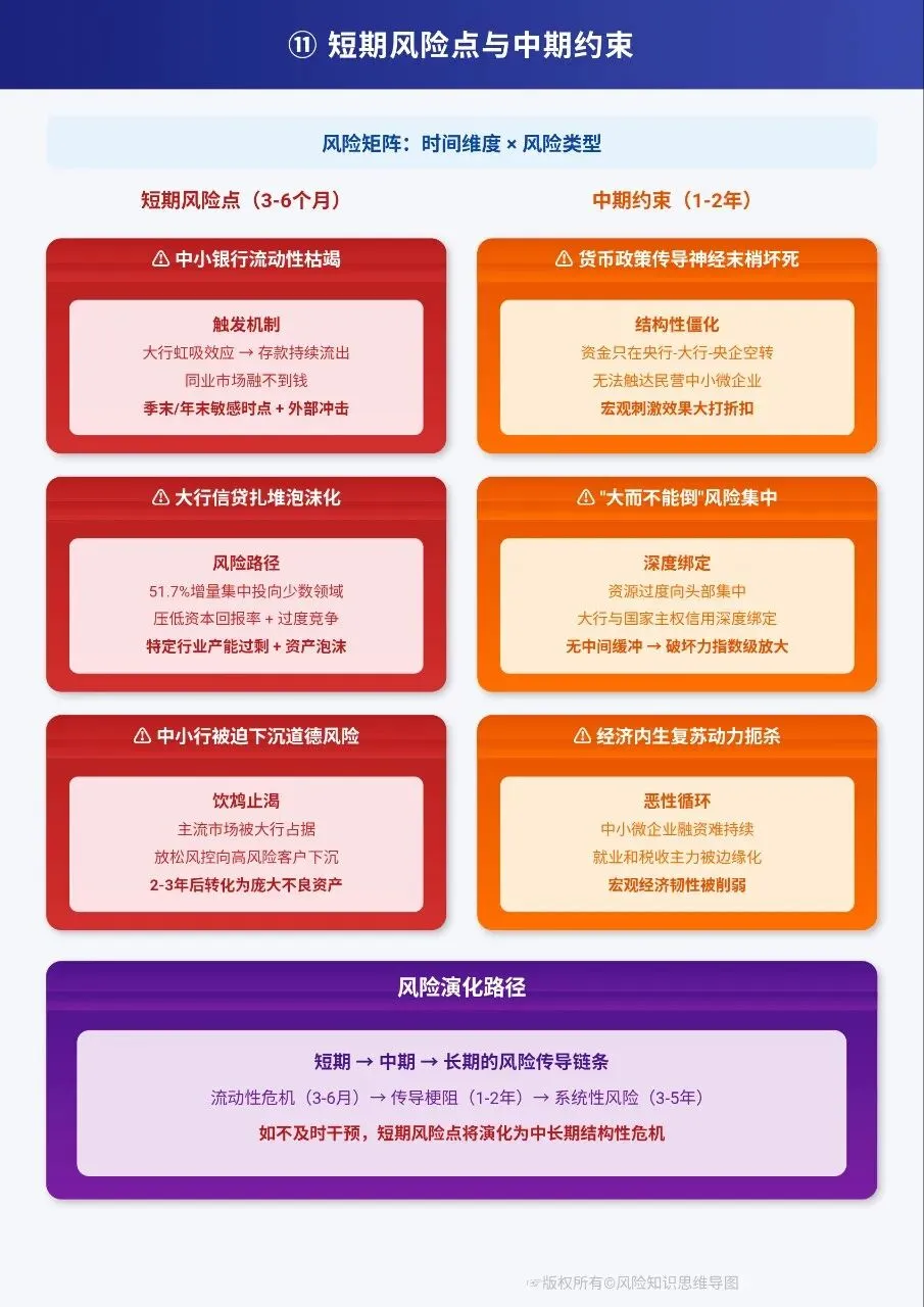 - “大而不能倒”的系统性风险强化:金融资源过度向头部集中,使得大型银行的资产负债表与国家主权信用、系统性风险深度绑定。一旦大型银行在特定领域(如地方债接盘、特定产业扶持)出现大规模坏账,其风险将直接传导至中央财政和央行,没有任何中间缓冲地带,系统性风险的破坏力被指数级放大。