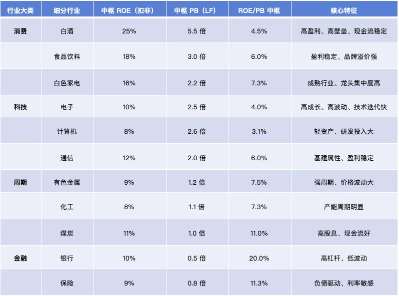 不同行业的商业模式、资产结构、盈利模式不同,合理的 PB-ROE 区间差异巨大。例如,消费行业属于轻资产、高盈利模式,中枢 ROE 约 15-20%,中枢 PB 约 2.5-3.5 倍;而银行属于重资产、高杠杆模式,中枢 ROE 约 8-12%,中枢 PB 仅 0.5-1 倍。若用统一的 “PB<1 且 ROE>10%” 标准筛选,会错过所有消费龙头,反而选中大量低 ROE 的银行、地产股,陷入价值陷阱。