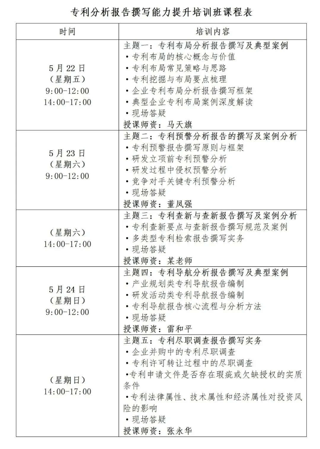 企业可通过专利情报分析,了解本技术领域中,哪些技术专利申请较集中,哪些技术的专利申请尚有空白点;留有空白点的技术是否有经济价值,对其进行技术研发的可行性及是否符合该行业的发展动向等问题,从而帮助企业做出最终研发决定,避免无效投入和开发的盲目性。专利分析报告是专利分析的最终成果之一,报告撰写要避免面面俱到确没有深入挖掘,专利分析报告的形成需要经过多次推敲和论证,最后形成一份能充分展示课题研究成果并得到认可的专利分析报告。为此,本平台将于2026年5月22日至24日在北京市举办“专利分析报告撰写能力提升培训班”。