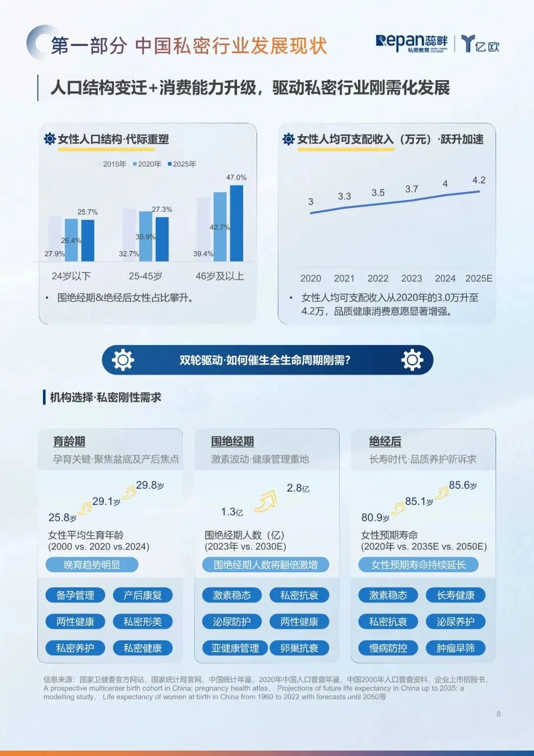 “健康中国2030”战略深化,强化女性全周期健康保障,推动行业医疗化、规范化发展。 公立机构增设更年期、盆底康复门诊,诊疗指南完善,加速行业标准化进程。 人口结构变化: