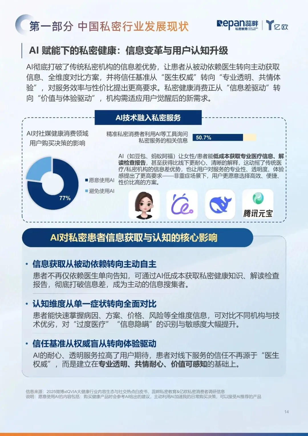 消费者决策更趋理性,重视专业度、隐私安全、价格透明与效果保障。 AI工具普及打破信息差,推动行业从信息差驱动转向价值与体验驱动。