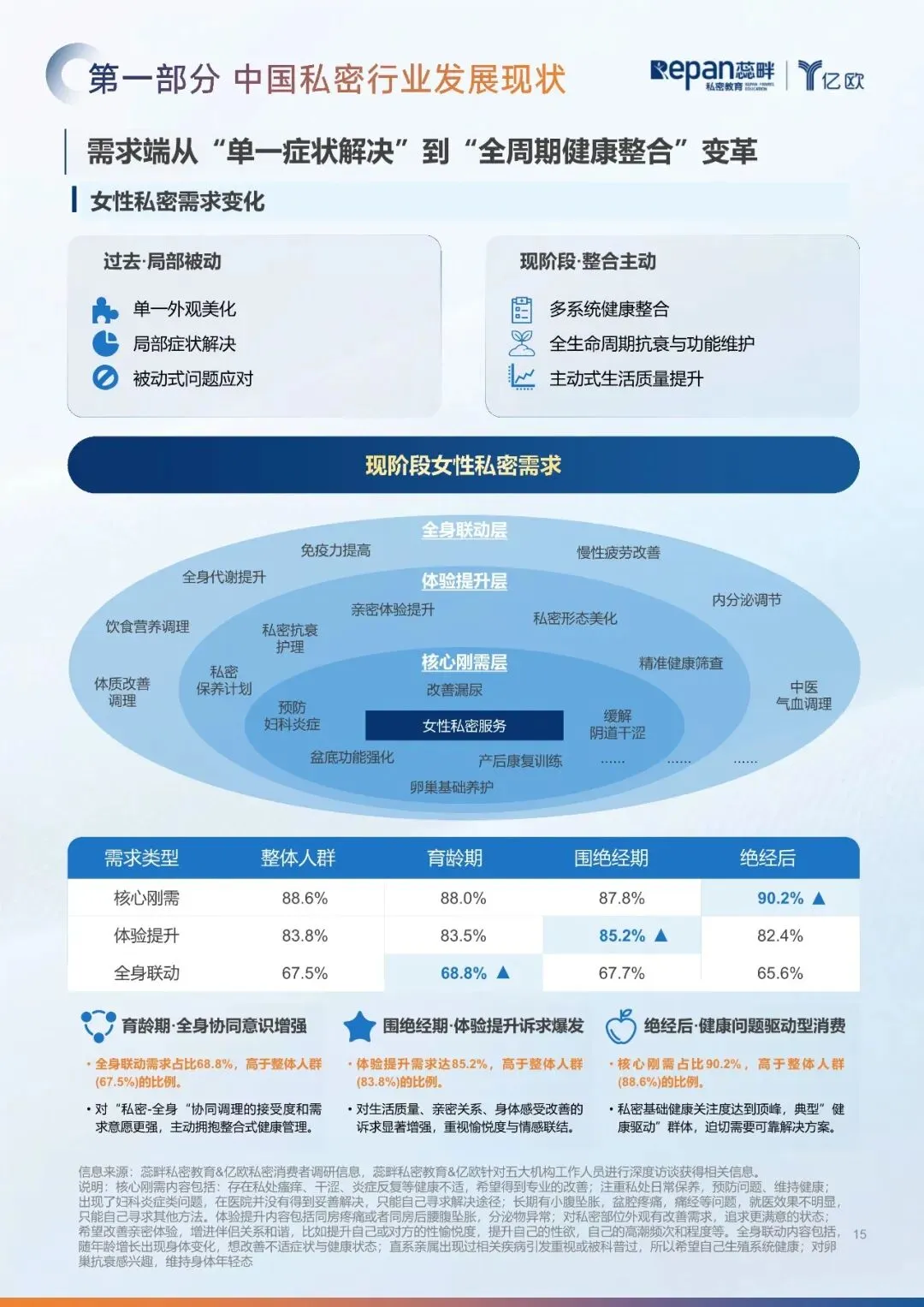 育龄期:产后修复、炎症改善、亲密体验优化为主,消费稳定、重养护。 围绝经期:受激素波动影响,失眠、情绪焦虑、私密干涩等刚需突出,价格敏感度较高。 绝经后:以亚健康管理、症状缓解、长期抗衰为核心,重视隐私与效果。 潜在人群:因尴尬、安全顾虑未消费,核心需求为炎症、漏尿等基础问题解决。 需求升级趋势: