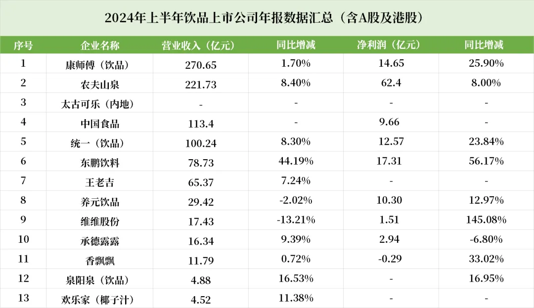 13家饮品上市公司发布2024年中期财报,东鹏饮料增幅领先,农夫山泉受舆论影响……