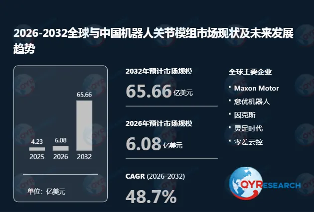 根据QYR(恒州博智)的统计及预测,2025年全球机器人关节模组市场销售额达到了4.23亿美元,预计2032年将达到65.66亿美元,年复合增长率(CAGR)为48.7%(2026-2032)。