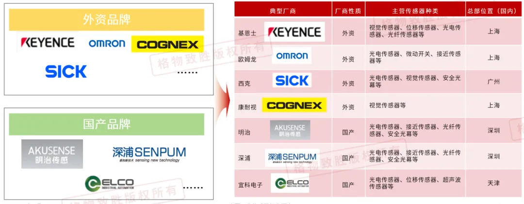 工业传感器市场分为国产与外资两大阵营。外资品牌主要包括日资品牌和欧美品牌,凭借多年的技术积累、品牌影响力等因素,仍然占据着国内市场的大部分份额;国产品牌起步稍晚,但近些年本土企业加速追赶,市场份额逐渐提升,在个别特定领域取得了显著的突破,未来有望进一步提高市场影响力。