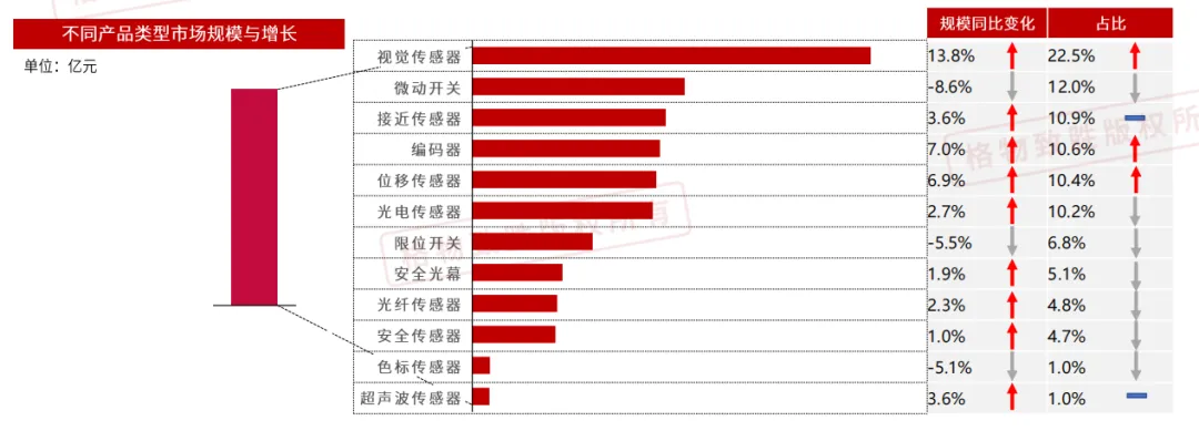 视觉传感器市场规模占比最高, 达到22.5%, 并且视觉传感器2024年产品市场规模相较于2024年有同比13.8%的增长, 高于行业市场总体水平。 除了原有新能源汽车制造、 电子制造行业的上升外, 工业自动化、 Al及工业机器人的融合等其他因素, 带动了2025年视觉传感器的下游需求。