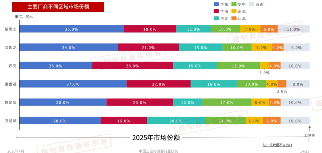2025 年工业传感器市场规模增长主要集中在华东地区,目前其工业传感器规模占总体市场规模的38.6% ,尤其以长三角地区占据主导地位,产业链完整,覆盖设计、封装测试到集成全环节,且下游行业用户数量多、市场集中,相比其他地区更具优势;而华南地区占总体市场规模的23.0% ,以珠三角地区为核心,其应用市场活跃,拥有大量的消费电子、化工行业等市场。