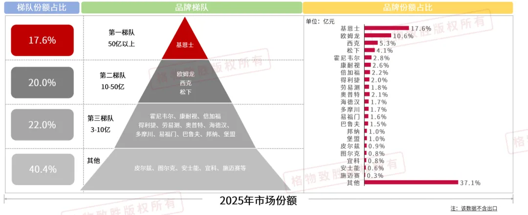 基恩士工业传感器产品销售额超过50亿元,是行业市场的第一梯队,份额占比共17.6% ;欧姆龙、西克、松下则属于行业第二梯队,份额占比共20% ;倍加福、霍尼韦尔、康耐视等则属于第三梯队,份额占比共22% 。
