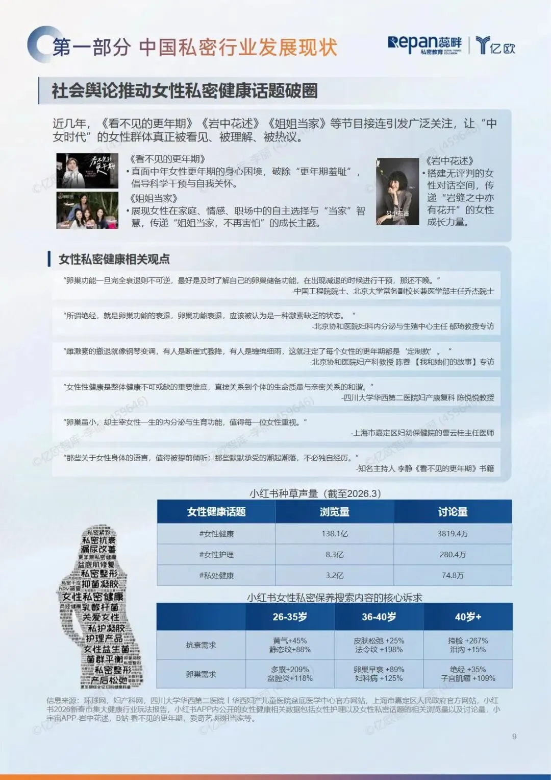 在“健康中国2030”战略推进与全民健康意识觉醒的背景下,女性私密健康与抗衰赛道迎来规模化发展机遇,同时行业也面临供需错位、机构增长瓶颈、标准缺失等结构性困境。当前私密行业已迈入以全生命周期健康管理为核心的高质量发展阶段,政策规范、人口结构变迁、社会认知破圈共同驱动市场刚需化扩容,消费者需求从局部症状解决升级为健康、体验、抗衰、全身联动的系统化诉求,AI技术普及更推动消费决策向专业透明、价值驱动转变。 本报告基于大规模问卷调研与深度访谈,覆盖育龄期、围绝经期、绝经后等全生命周期女性,系统剖析私密消费人群特征、决策路径与核心诉求,梳理妇产、产康、美业、大健康等机构的增长痛点,并依托“花根土”理论提出全周期服务升级方案,为行业规范化发展与机构长效增长提供数据支撑与实践指引。
