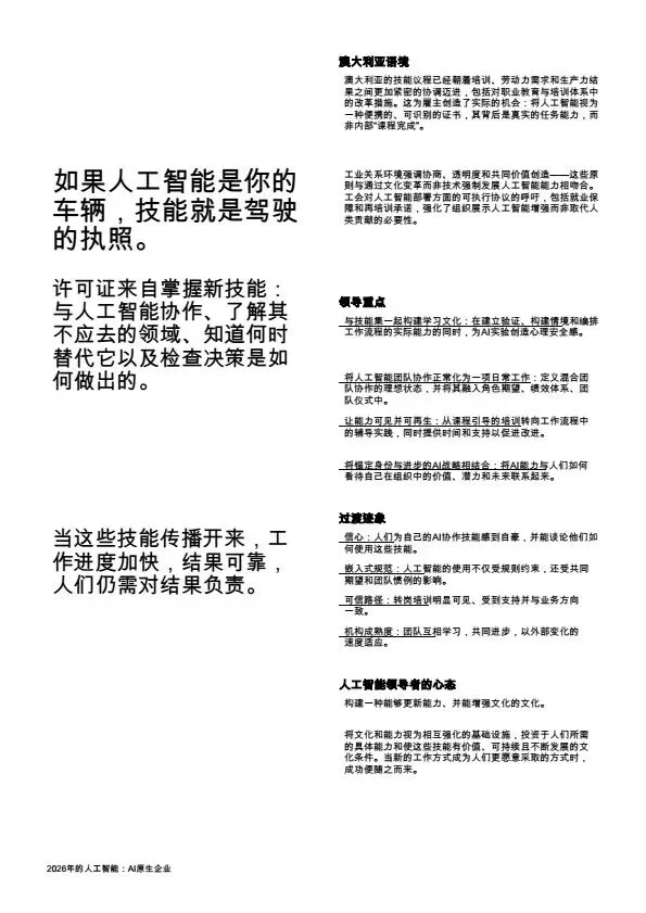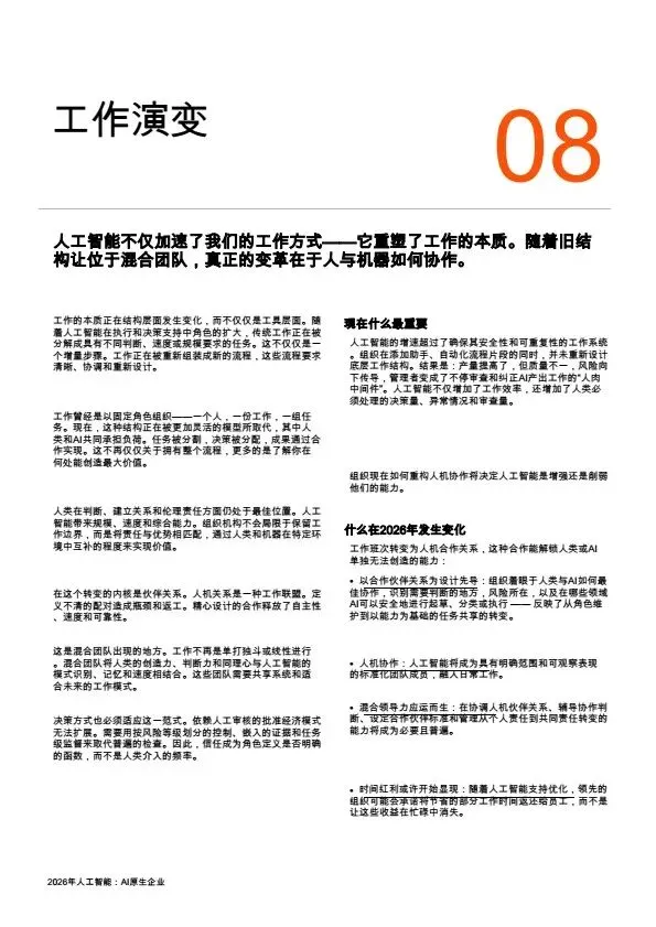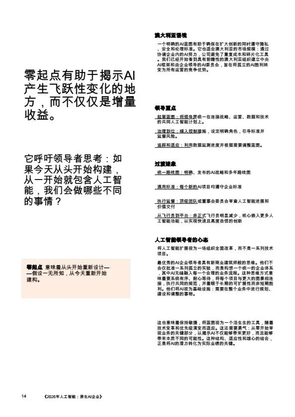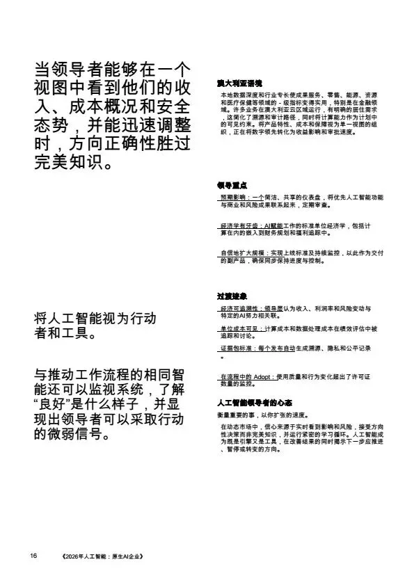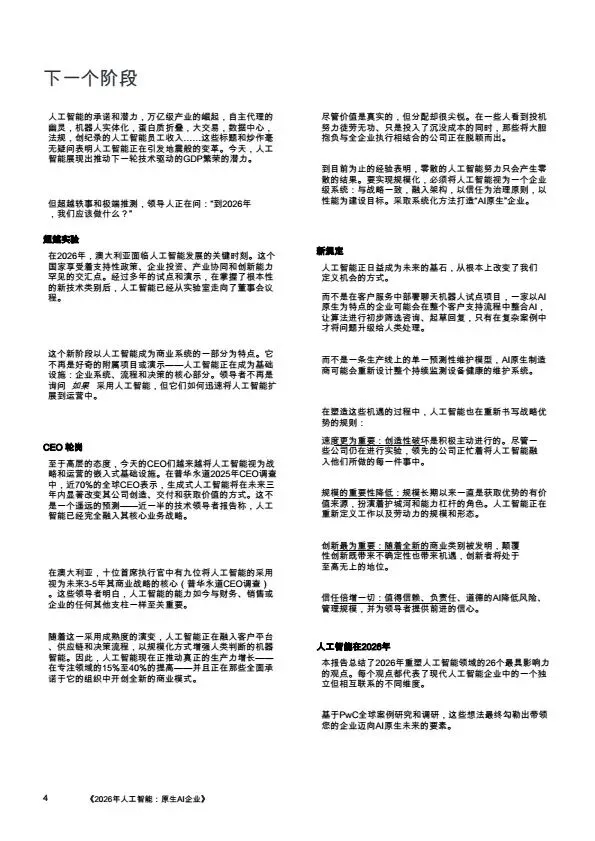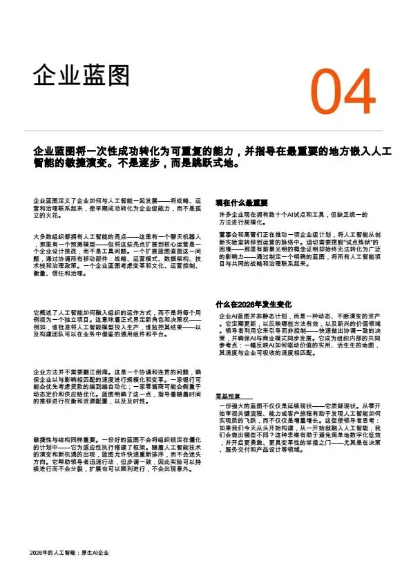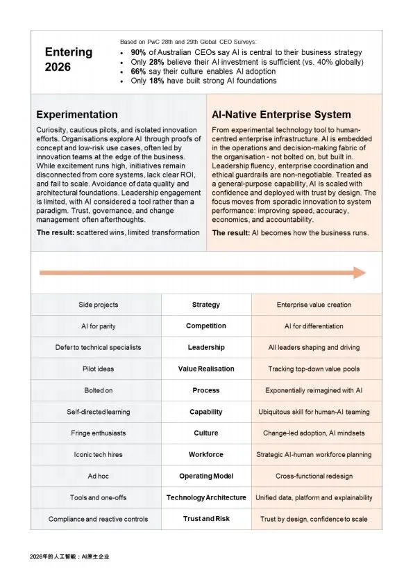 摘要:2026年,AI规模化应用成为企业转型核心,大量企业陷入“试点炼狱”,零散的AI试点无法转化为规模化价值。本文系统梳理企业架构设计逻辑:基于PwC全球案例,提出AI原生企业的转型路径,将AI从外挂工具重构为企业内置的核心能力,通过零基流程重构、统一治理框架、人机协同架构,解决AI规模化落地的痛点,为企业管理者、AI行业从业者提供转型参考。