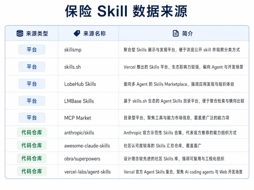 本次研究的样本构建遵循先广泛搜集、再强相关收敛的路径。我们首先从公开市场中覆盖各大技能展示平台、聚合平台与代码仓库等多类来源,对保险相关Skill进行大范围检索,详细数据来源见图1。在此基础上,结合Skill标题、描述、目录与说明文件,由大模型抽取保险相关关键词,并通过人工复核进一步完成来源去重、平台间二次引用清理和业务相关性筛查,最终从万级检索结果中收敛出539个保险强相关Skill。由此形成的样本池,既尽量保留了当前市场供给的广度,也尽量避免把泛金融、泛办公或仅与保险存在弱关联的条目误纳入分析对象。换言之,我们分析的并不是泛泛与保险沾边的Skill,而是一组能够证明与保险业务具有实质关联的能力集合。