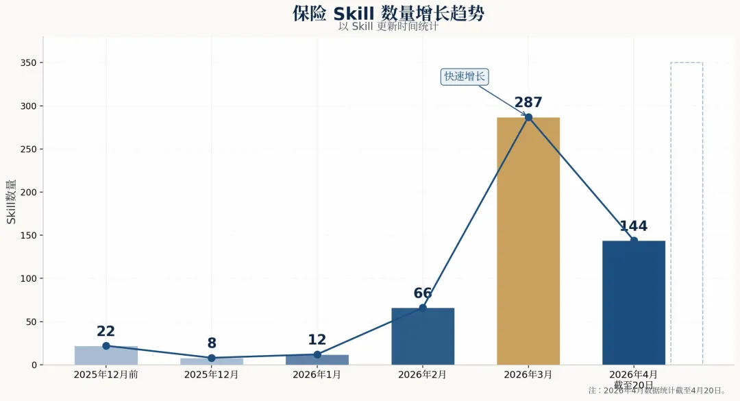 从样本来源与时间分布看,当前保险Skill市场已不再是零散试水,而是开始进入明显增量阶段。若以Skill更新时间观察,2025年12月以前样本更新的增量仍较有限,进入2026年后开始明显提速,2月升至66个,3月进一步跃升至287个,4月截至20日仍达到144个。尽管这一统计口径更接近市场活跃度和迭代频率,而不完全等同于Skill的首次创建时间,但它依然足以说明,保险相关能力组件正在快速进入集中发布和持续更新阶段。也正因为如此,当前市场真正值得回答的问题,已经不只是有没有保险Skill,而是这些Skill是否具备进一步集成、复用和稳定调用的基础。