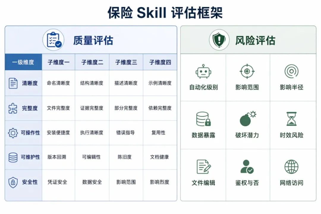 以上两个反例仅仅是当前存在问题的一个缩影。综合来看,当前市场上保险Skill的常见问题可以大体归为四类:一是场景定义含混,触发条件和适用边界不明确;二是结构不完整,缺少示例、限制、依赖声明、错误处理和版本信息;三是过度依赖特定公司流程、特定平台或本地数据,难以复用迁移;四是对数据安全、权限管理和审计留痕交代不足。也正因此,保险Skill的建设不能只停留在"把经验写下来",而需要进入"把经验封装成可验证、可治理、可迁移的能力组件"阶段。
