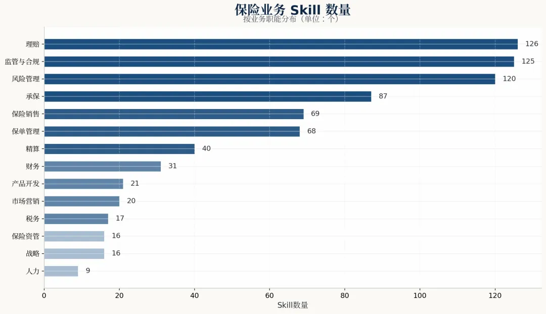 洞察2:保险Skill的业务重心高度集中在特定场景。业务职能上,理赔、监管与合规、风险管理、承保位居前列;业务细分上,合规审查与内部控制、数据分析与商业智能、风险评估与核保决定、理赔审核与理算是最主要的落点。财务、战略、人力等支持部门虽有少量覆盖,但明显不是市场主流。
