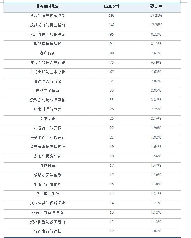 细分到业务子职能(如表1),合规审查与内部控制(17.21%)和数据分析与商业智能(12.28%)显著领先,其后是风险评估与核保决定(8.22%)以及理赔审核与理算(8.13%)。这表明保险Skill的核心价值短期内更多体现在"帮助专业人员更快完成判断准备和材料加工",而不是直接替代复杂业务决策本身。