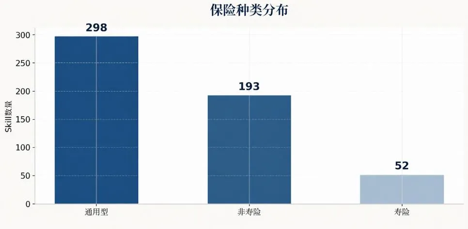 从保险种类看(如图5),通用型Skill(适配寿险与非寿险场景)数量达到298个。专用于非寿险类Skill的有193个,而寿险类仅52个。通用型占绝对多数,说明大量供给仍停留在"适用于保险行业一般场景"的宽泛设计;相较于非寿险而言,寿险领域当前仍缺少足够成熟的公开Skill沉淀。