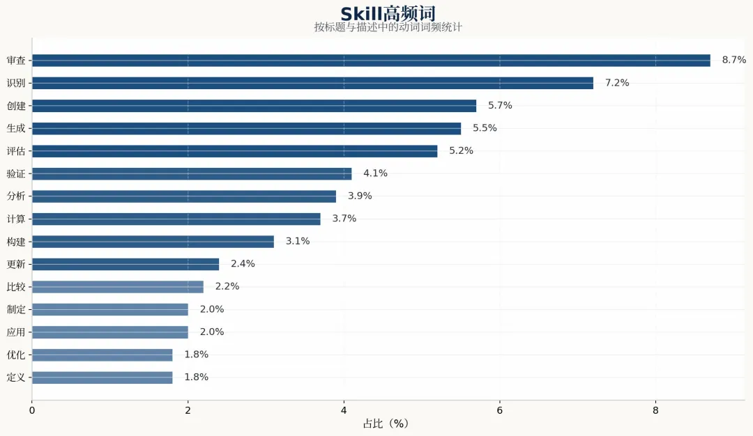 从标题与描述中的高频动词观察,现有保险Skill的典型动作并不是"自主执行整条流程",而是围绕若干离散步骤提供辅助。如图6所示,审查占8.7%,识别占7.2%,创建占5.7%,生成占5.5%,评估占5.2%。这些动词共同指向一种非常鲜明的能力画像:当前公开市场上的Skill更擅长帮助用户看材料、找问题、做判断准备和产出文本,而不是代替用户完成高自治、长链条的业务闭环。