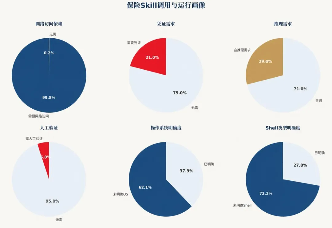 洞察4:保险Skill的复用性和通用性普遍偏弱,外部依赖明显。近乎全部样本都需要网络访问,但21.4%涉及凭证,62.1%未明确操作系统,72.2%未明确Shell类型,只有0.7%可视为可独立运行。很多Skill深度绑定特定平台、接口或公司内部流程,迁移到其他保险机构时需要额外改造。