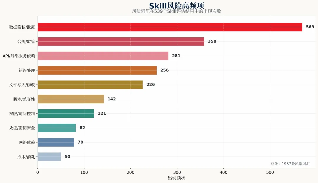 洞察5:保险Skill在实际场景应用的安全性仍需审慎考虑。虽然Skill整体安全性均分较高,但这更多反映样本在"高破坏性操作较少、显式凭证模式有限"上的静态结构特征,并不意味应用于真实业务的风险就会很低。风险分析表明,在保险Skill使用的过程中,数据隐私泄露、监管合规、外部服务依赖等风险点高频出现,表明保险场景中的数据外传、权限边界和审计要求仍是保险Skill落地的核心挑战。