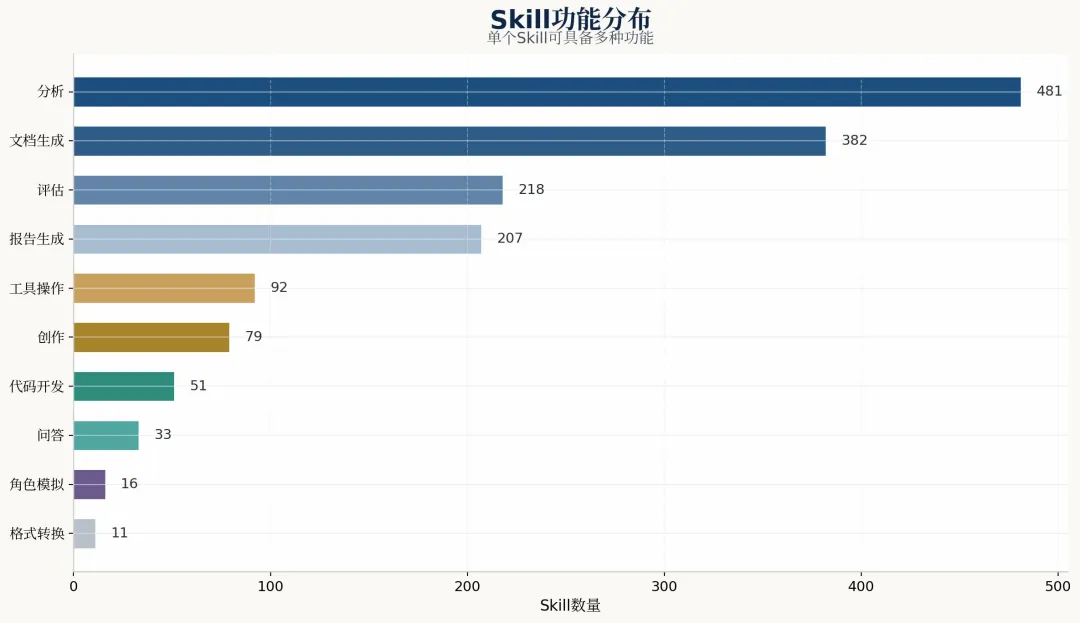 图9展示了保险Skill的10类功能类型分布,单个Skill可以具备多种功能。具体来看,保险Skill的价值重心非常集中,分析类共有481个,文档生成类382个,评估类218个,报告生成类207个。Skill本身非常适合做保险材料分析、业务报告撰写等任务,进而市场上的保险Skill也专注于认知处理和文本输出。而代码开发、角色模拟等功能不是保险业务的重点,故相关Skill涉及较少。
