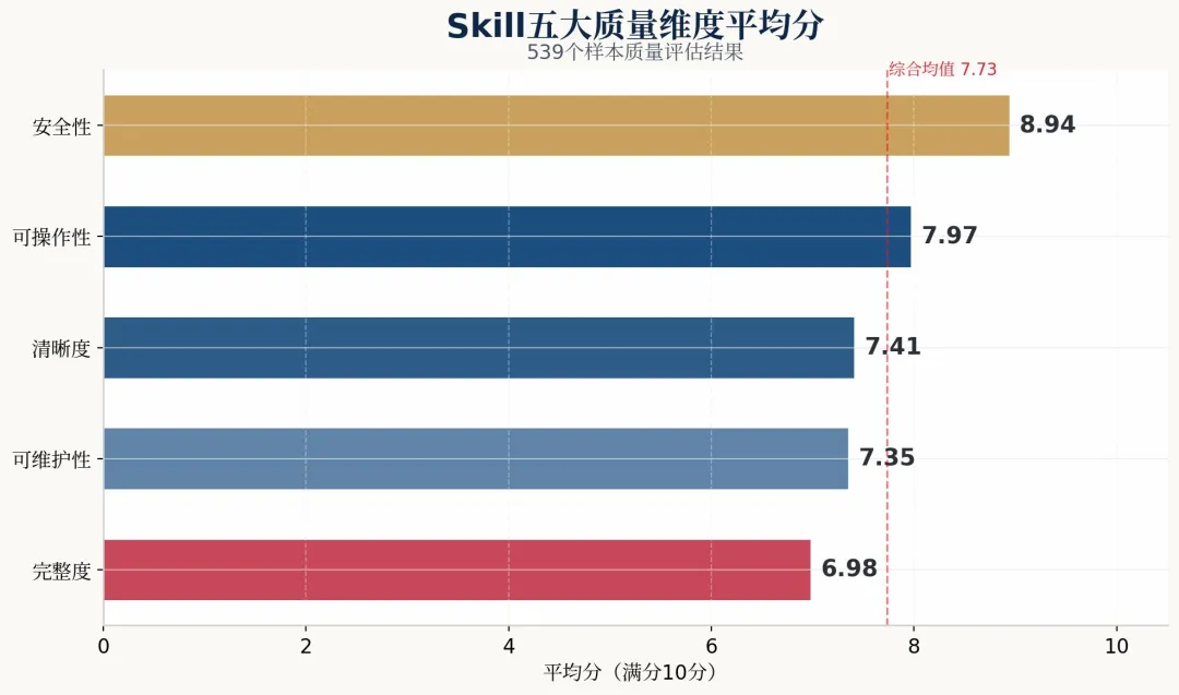 从Skill质量的五个维度看,当前保险Skill市场呈现出"整体不差,但短板集中"的结构。539个样本的清晰度均值为7.41,完整度6.98,可操作性7.97,可维护性7.35,安全性8.94,派生综合均值为7.73。分布上,大多数Skill聚集在7分和8分区间,说明市场已出现一批具备基本规范意识的技能包,但距离真正可复用、可审计、可迭代的行业级标准仍有距离。