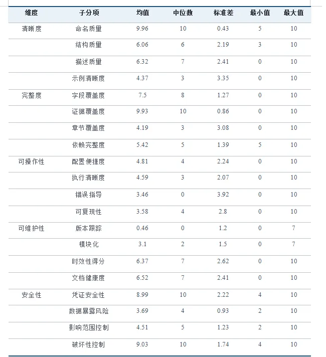 子维度统计最能反映保险Skill目前的真实短板(如表2)。清晰度中,命名质量高达9.96,但示例清晰度只有4.37;完整度中,字段覆盖度和证据覆盖度分别达到7.50与9.93,但章节覆盖度仅4.19;可操作性中,配置便捷度4.81、执行清晰度4.59、错误指导3.46、可复现性3.58;可维护性中,版本跟踪几乎缺席,均值仅0.46。对于Skill安全性,虽然现有Skill已经有较好的凭证安全性和防破坏控制,但仍存在数据暴露风险,一旦出现安全问题较难控制影响范围。总体而言,大多数保险Skill在"元信息层面"已经较好,但在使用体验层面仍有待改进。