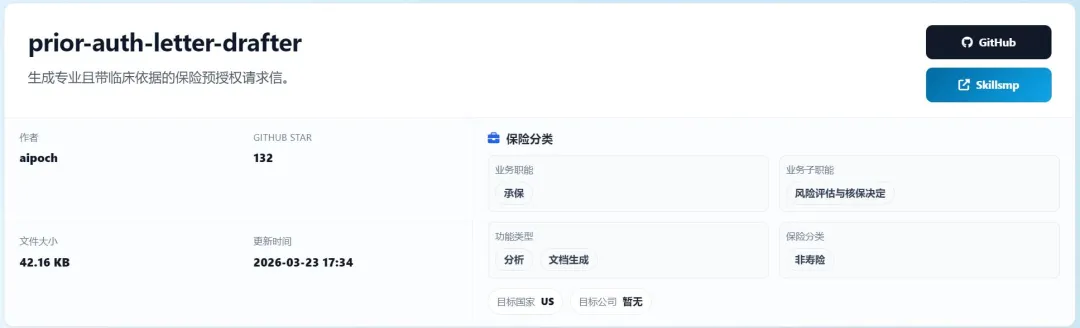 prior-auth-letter-drafter是协助医疗机构为保险公司制作专业保险预授权请求信的Skill。从案例首页信息看,prior-auth-letter-drafter的定位明确,且作者、热度、文件大小、更新时间、业务分类和功能类型都被清楚列出。从图11中可以看到,该样本在保险业务上归入“承保”,业务子职能明确为“风险评估与核保决定”,功能上同时覆盖“分析、文档生成”。该Skill功能边界定义清晰、结构完整,调用者在尚未打开具体子文档前,就已经能够判断该Skill适不适合自己的任务。