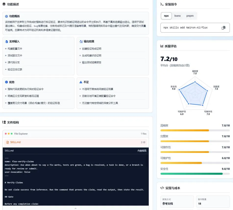 进一步看详细页面(图12),优质的Skill之所以值得参考,并不是因为"内容写得多",而是因为它能让智能体和用户都知道何时调用、如何调用、遇到问题怎么办。这类Skill通常具备几项关键要素:功能描述清晰、问题导向明确、文件结构分层合理,能够区分主说明、脚本、参考资料和模板资产;同时清楚交代外部服务、依赖、权限、错误回滚与审计要求,并对敏感数据和隐私处理给出明确边界。这类Skill更接近真正可集成的生产单元。
