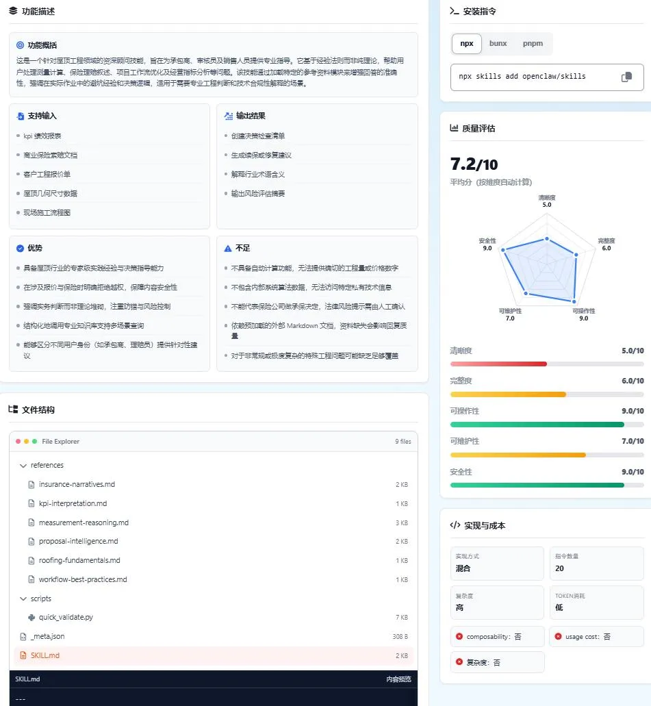 反例二Skill则聚焦于屋顶工程领域的保险理赔。与反例一不同,它并不是极简结构,它包含高达9个不同的文件。然而,文件数更多并没有自动转化为更高的质量,其功能概括未能明确将该Skill的功能针对到可处理的一个具体问题,而是试图扁平化地囊括该场景下的所有功能,界定过于宽泛。这类Skill的核心问题在于"边界不清"。当一个Skill同时想覆盖多个任务、多个对象和多个流程,却没有明确的触发条件与优先级时,它就会变成一个对人和智能体都不友好的"大杂烩"。这类Skill常见的问题还包括目录结构松散、全部内容堆叠在Markdown中、缺少输入输出约定,以及没有办法让调用者判断它究竟适用于哪一类保险场景。