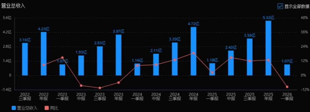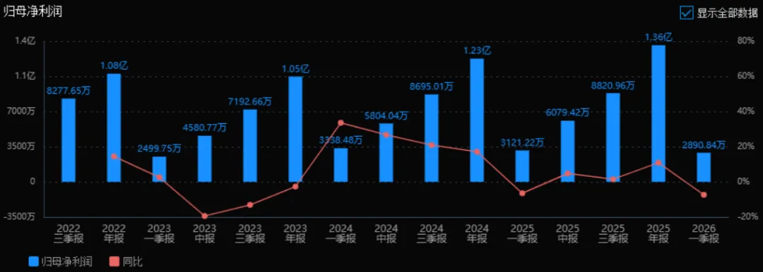2025年归母净利润为 1.36亿元,相较于2024年的1.23亿元增长了 10.87%。评价: 净利润增速略低于营收增速,但依然实现双位数增长,盈利能力持续增强。2025年各季度增速波动较大(一季报为负),全年仍回归正增长,说明经营逐步恢复。