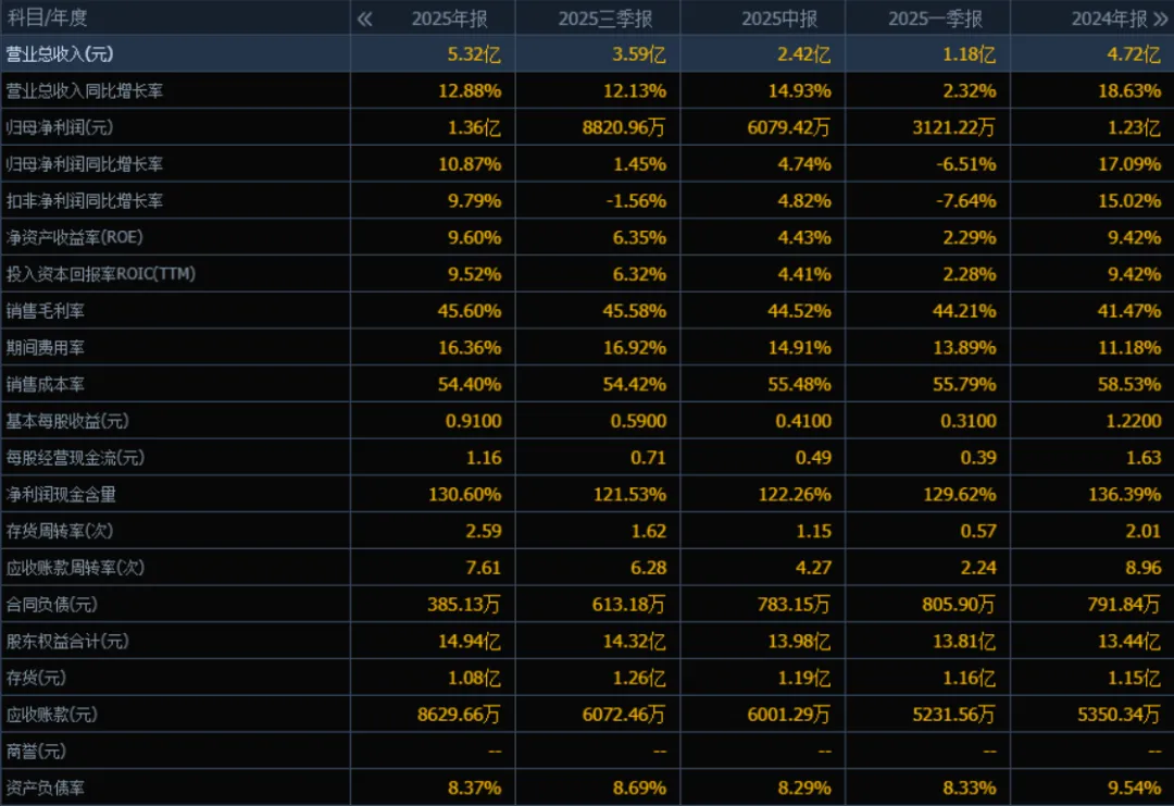 2025年营业总收入为 5.32亿元,相较于2024年的4.72亿元增长了 12.88%。评价: 公司营收保持稳健增长,增速较2024年的18.63%有所放缓,但仍处于两位数增长区间,表明主营业务仍具扩张能力。