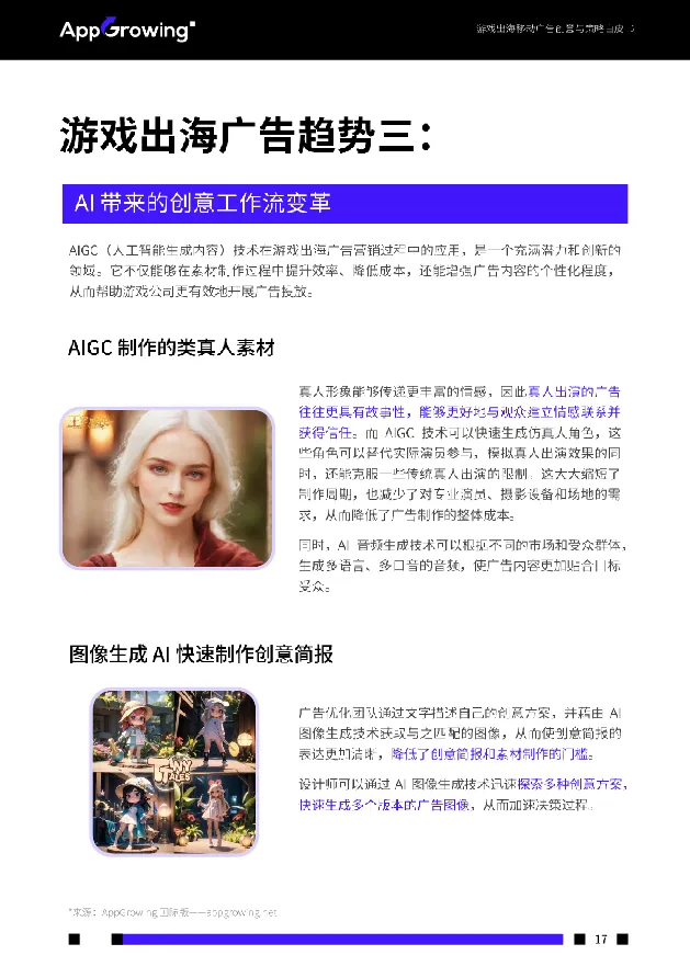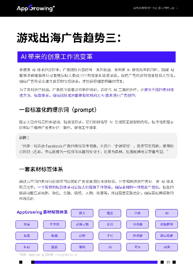 • AI深度重构广告创意工作流:AIGC技术用于生成类真人素材、多语言配音及创意简报图像,显著降本提效;成功应用需配套标准化prompt体系与标签系统,保障创意一致性与个性化。