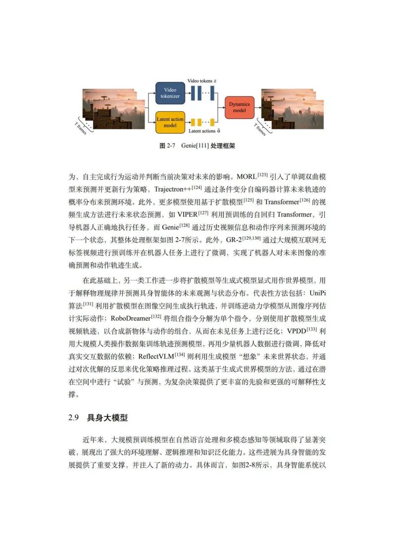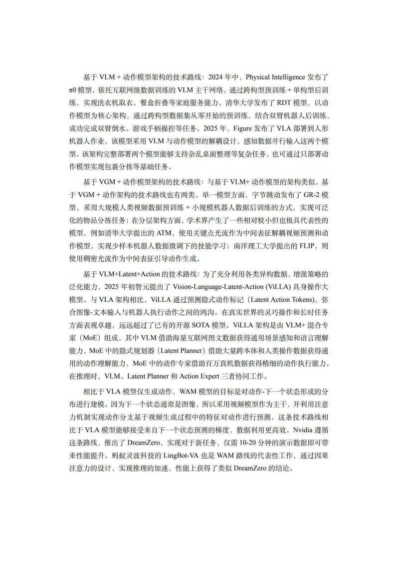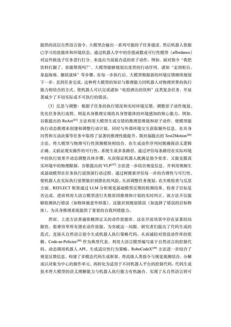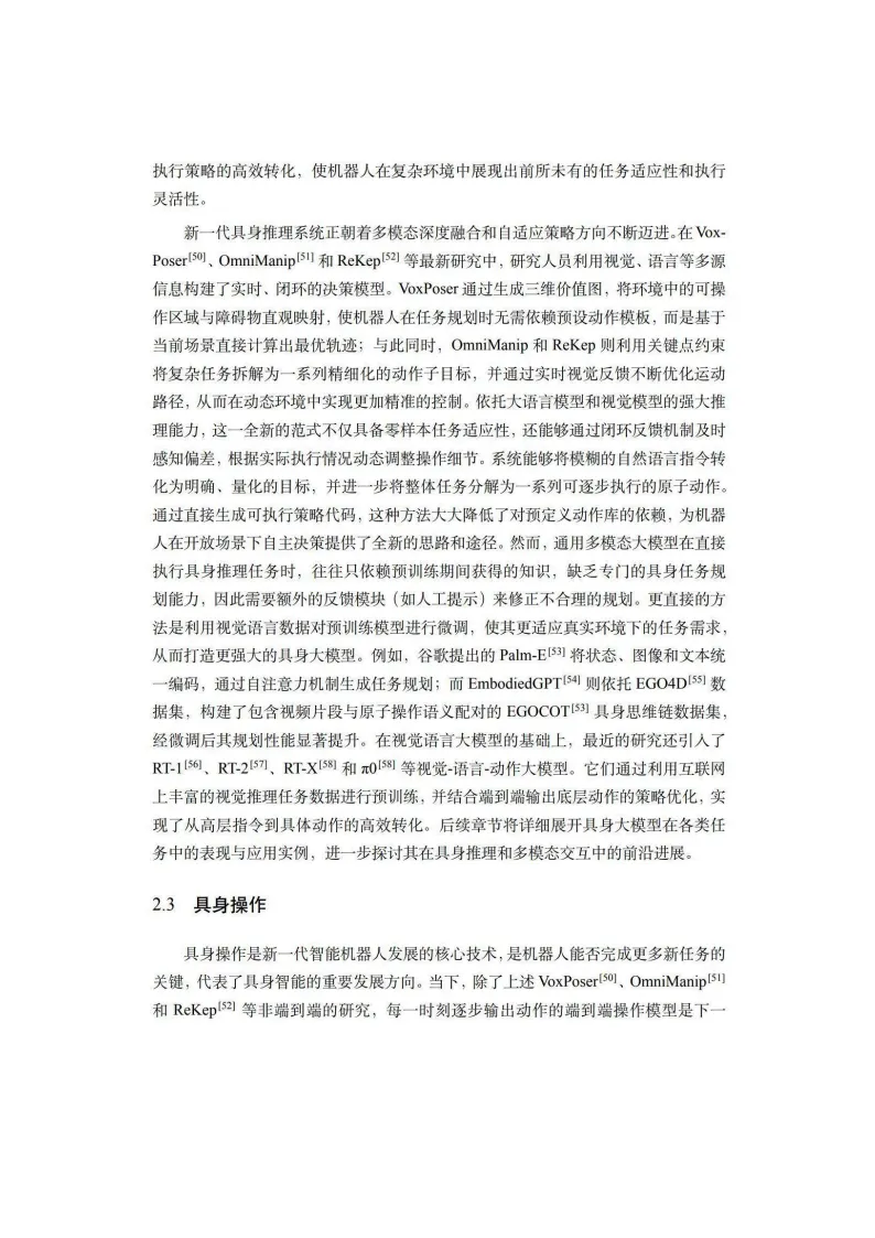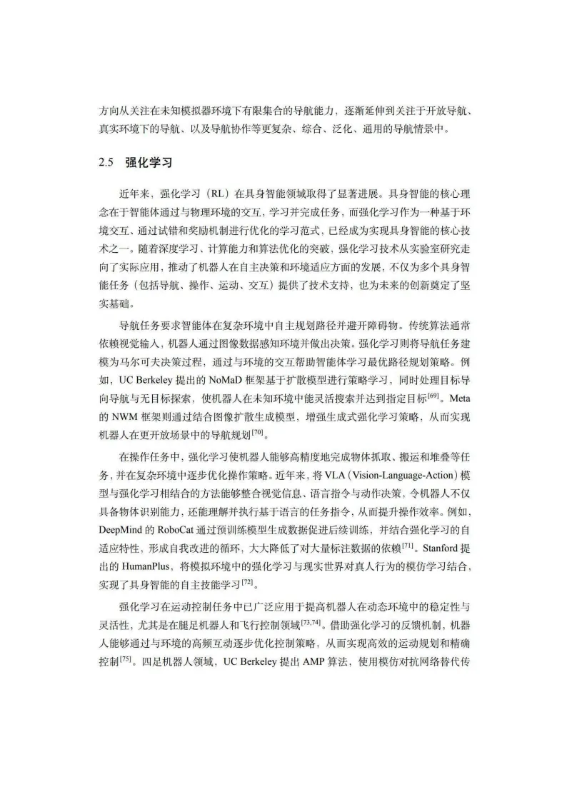 本白皮书系统阐述了具身智能的概念内涵、关键技术、数据集与平台、行业应用及未来展望。具身智能强调智能体通过物理本体与外界环境互动,具备涉身性、情境性、主动性和交互性,被视为人工智能走向物理世界的核心关键。其发展历程可追溯至图灵1950年的构想,历经20世纪80年代行为主义AI的奠基,近年在大语言模型驱动下迎来爆发式增长。在关键技术层面,白皮书详细剖析了具身感知、推理、操作、导航、强化学习、交互、群体具身智能、世界模型、具身大模型及安全等十大方向。其中,视觉-语言-动作大模型成为新一代机器人智能中枢,世界动作模型则进一步提升了泛化能力。具身智能安全涵盖规划劫持、传感器攻击、人机交互等风险维度,是系统落地的必要保障。数据集与平台方面,白皮书将数据划分为真机数据、仿真数据和互联网视频数据三层金字塔,分析了Isaac、MuJoCo、SAPIEN、Genesis等主流模拟器的技术特点与应用场景,并探讨了“模拟到现实”鸿沟的解决路径。行业应用覆盖生活服务、工业、农业、交通、能源等领域。家庭服务机器人已实现衣物折叠、烹饪辅助等复杂任务;工业领域具身智能正推动柔性制造与自主决策;医疗康养、特种作业等场景也展现出广阔前景。白皮书指出,具身智能正从标准化劳动替代向高附加值服务创造跨越,催生“人机共生”新生态。