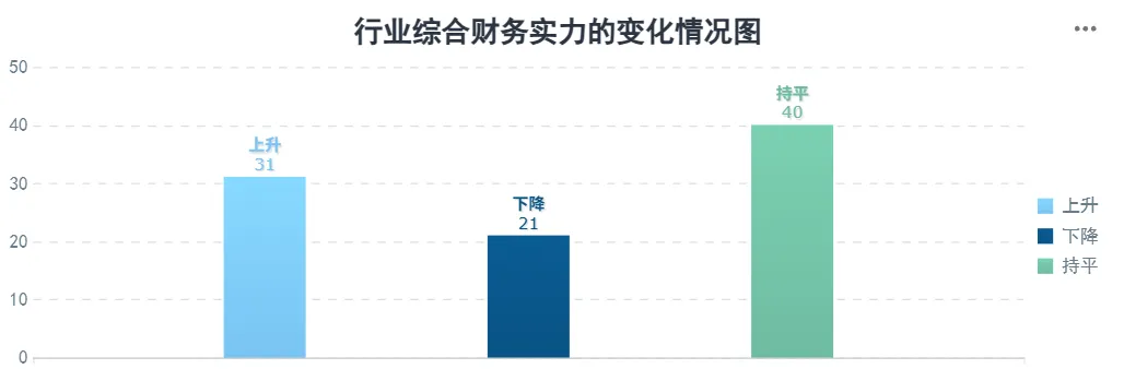 | 本行业综合财务实力变化情况是指行业内公司综合财务实力分数相较于过去一年中的同比变动幅度大于等于5%以上的情况, 其中变动分为上升和下降,此外变动浮动小于5%以内,定义为持平,反映了行业内不同受评主体综合财务实力变化的趋势。 |
