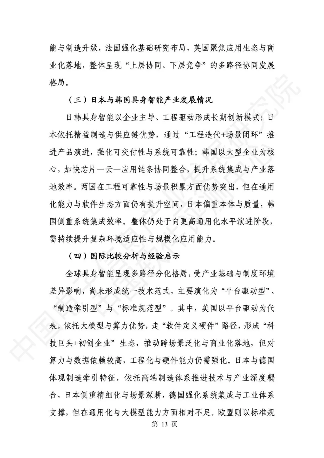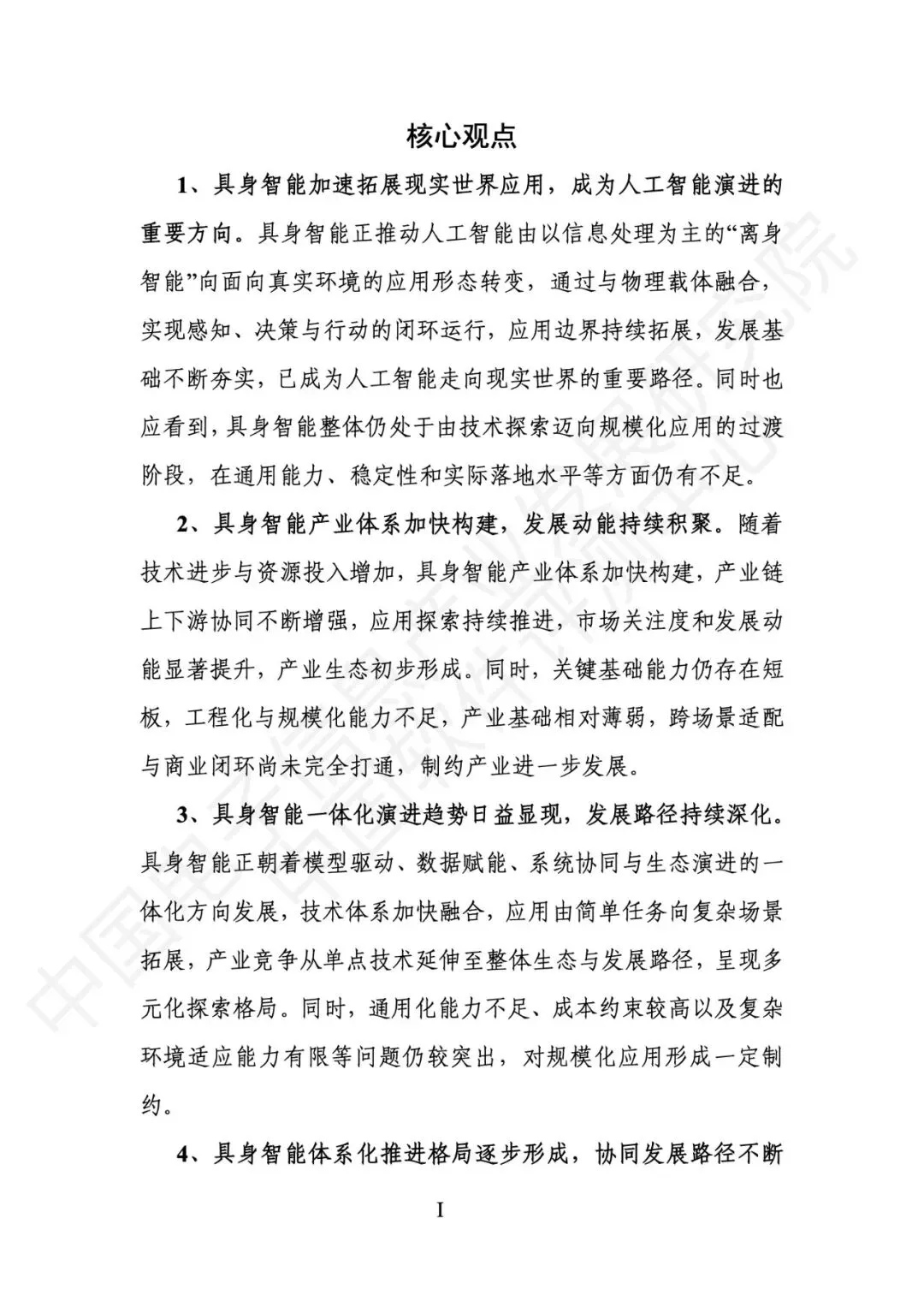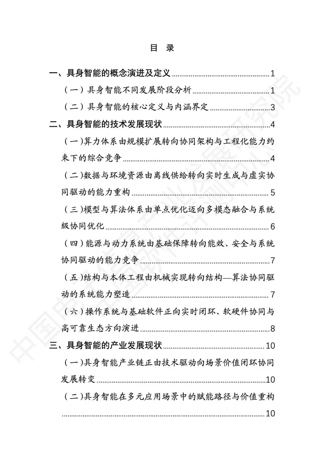 本报告针对具身智能技术和产业的新发展新趋势进行了系统分析:从具身智能概念演进与内涵界定切入,提出了具身智能的核心定义与机理特征,以及通用、专用、前沿三类具身智能产品分类形态;剖析出具身智能四层技术体系架构,从产业链结构、应用场景与资本动向等维度分析产业发展态势;综合比较全球主要国家和地区的具身智能产业发展路径,并从空间布局与创新能力等方面分析了国内产业发展现状及存在问题;在此基础上,对全球技术演进趋势、产业竞争格局及发展路径与治理框架进行了综合研判并提出方向性认识。